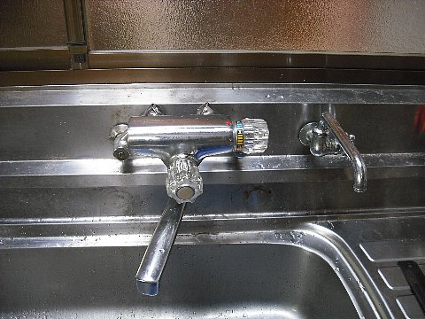 既存混合水栓金具は通常浴室で使うサーモスタットタイプが取り付けられており