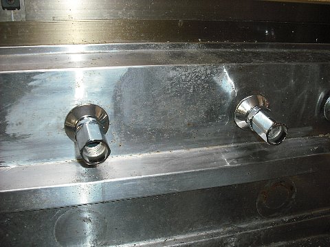 ステンレスの流し台の水切り板が邪魔をして湯水配管に取り付ける偏心管が取り付けられない状態です。