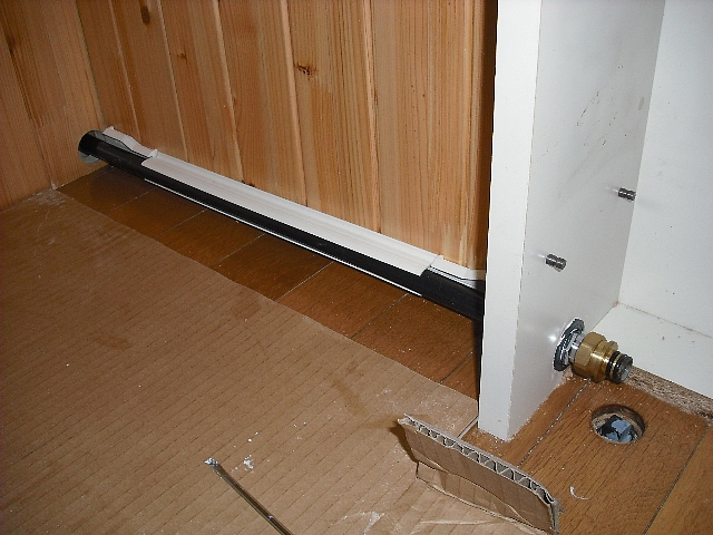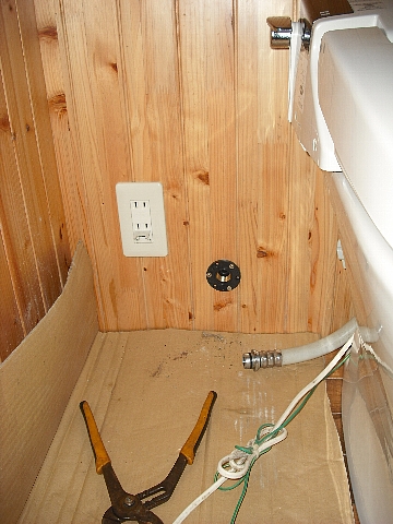 手洗い器側は床に配管カバー這わせて