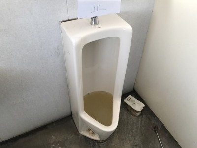 倉敷市福江のお客様から 「男子便器が詰まっているので修理してほしい」と ご依頼をいただきました。 尿石が詰まって流れない状態です。 上に「使用禁止」と貼ってあります。 排水口に入れワイヤーを回