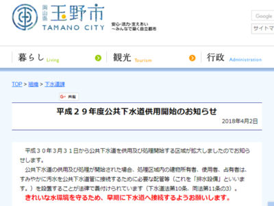 玉野市の田井地、西田井地、梶岡の各一部で下水道が供用開始しました。