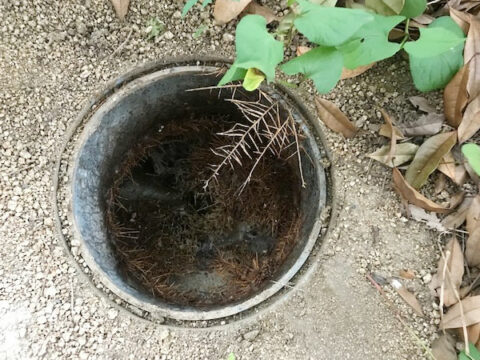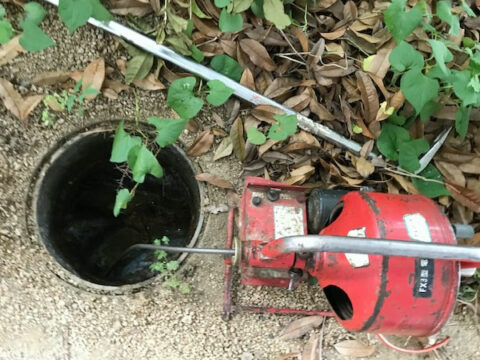 調べたところ、木の根でトイレが詰まっていました(+_+)