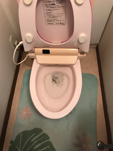 岡山市南区で「1階のトイレが詰まった」とお電話を頂きました。 流しても紙が残る状態です流れ方から便器内部に異物が混入している様子異物混入の場合、便器脱着作業となります。 便器を取り外したところ排水部品の所に異物が引っかか