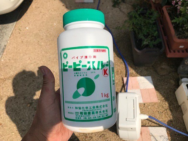 台所排水管の詰まり除去作業にピーピースルーも一緒に使用して