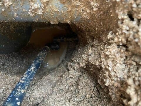 排水管の下を通る水道管の奥の方で漏水していました