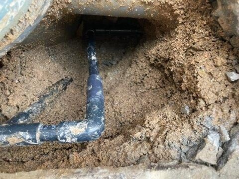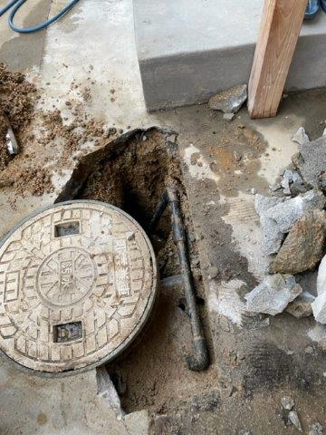 原因ヵ所を特定するためにコンクリートを斫って地面を掘っていきます