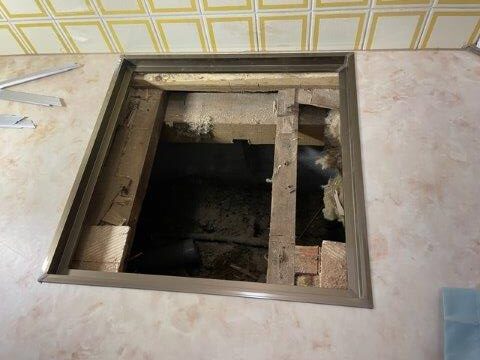 床下で漏水しているけれど、どこからも床下に入れない場合は床を開口して点検口を作成します。