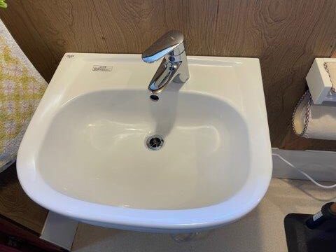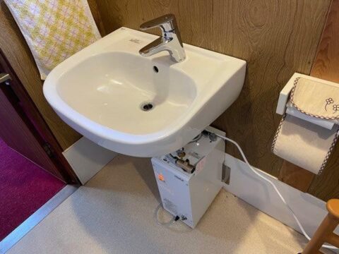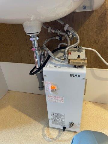 新しい洗面器と小型電気温水器の設置工事が完了しました。(^^)/