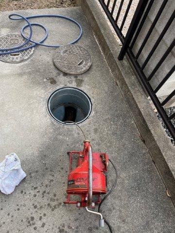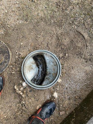 詰まっている排水マスの下流からワイヤー式の排水管掃除機で試してみましたが、詰まりが酷くて直りません!(+_+)