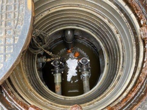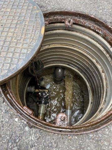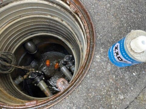 2つある排水ポンプの右側の配管が外れて、アクセル全開で吹き出していました