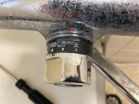 温度調整、シャワーとカラン切替、定量止水とハンドルが3つあります。