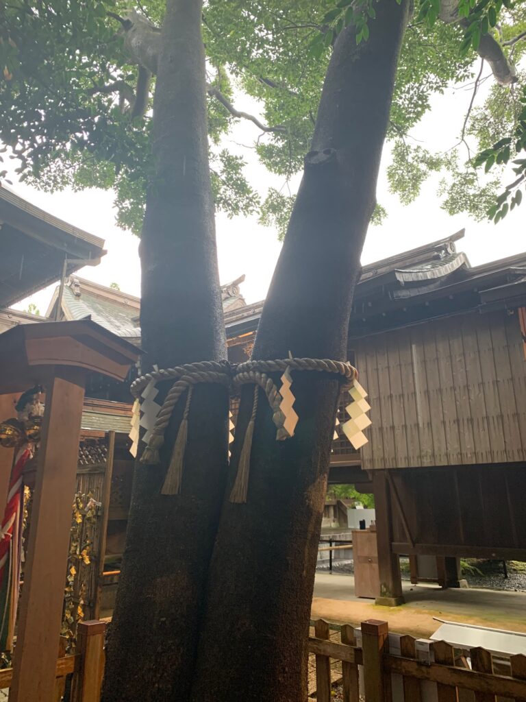 本堂のすぐ左に位置する場所に『小賀玉(おがたま)』と呼ばれる、榊と並んで神霊(みたま)を招きよせる御神木があります。2本の幹が根元でつながり寄り添うように並んでおり、男性は左廻り、女性は右回りに小賀玉をまわり願掛けをすることで良縁に出会えると言われています。