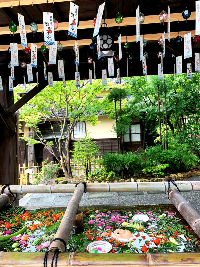 短冊に願いを書いたので、月毎に変わる鮮やかな花手水で手をお清めして帰宅しました。