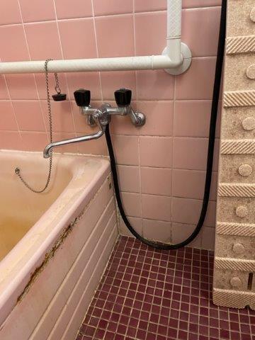 岡山市南区飽浦のお客様から浴室のシャワー交換のご依頼を頂きました。 40年くらいお使いの黒いハンドルの蛇口! 昔は蛇口の黒いハンドルや黒いタイルなんかが流行った時代がありました 黒いシャワーホースも当時のものなのですごい