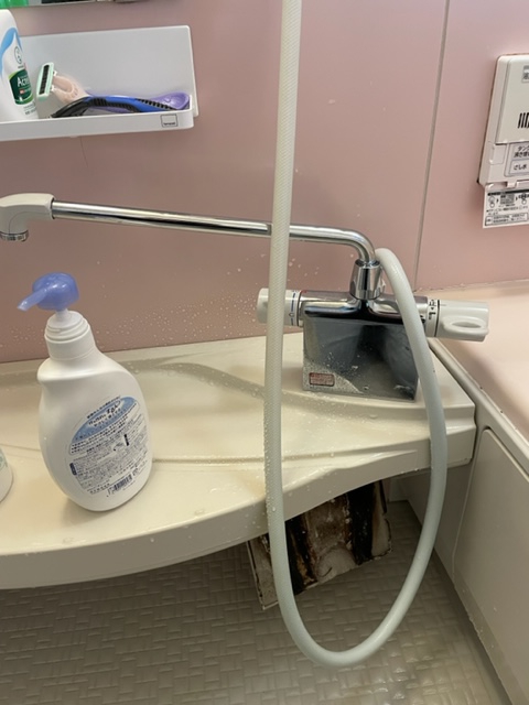 岡山市中区四御神のお客様からお風呂のシャワー水栓交換のご依頼を頂きました。 シャワーは壁に付いている壁付タイプをよく見ますが、今回交換するシャワーは台付きやデッキ式と呼ばれている浴槽のフチやカウンターに設置するタイプのシ
