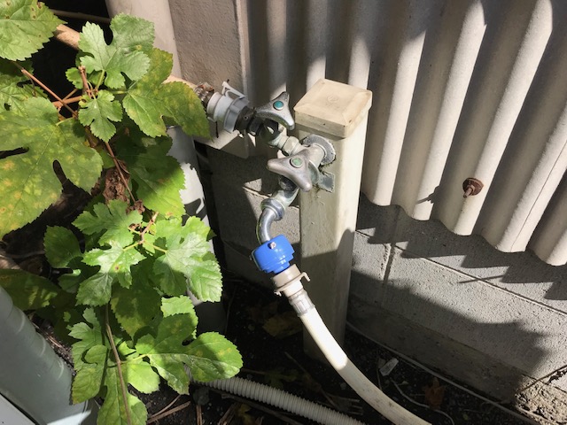 岡山市南区福富西のお客様から「蛇口を増設したい」とご依頼を頂きました。 先ずは現地へお伺いして状況の確認です。 確認してみると倉庫外側にあった2口の洗濯機用矢口を増やしたいという依頼でした。 増設するために設置してある蛇