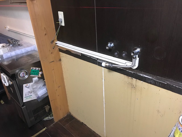 いつもありがとうございます。岡山水道センターです(^_^)岡山市北区で給排水配管の増設工事のご依頼を頂きました。まずは台所の給水・給湯・排水配管工事です 台所流しを置く前に排水管を増設します。 流しを置いて給水・給湯配管