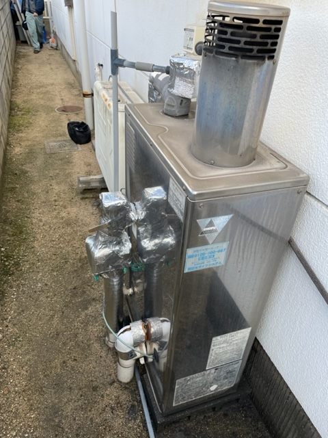 給湯器の修理や交換でお伺いすると、よくメンテナンス会社のシールが貼ってあるのを見かけます。 向こうから歩いてくるのは岡山水道センターの社員です。 給湯器があるのは御覧の通り家の敷地の奥の方。 こんな所にまで無断で入ってシ