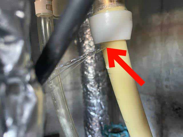 岡山市北区野田のお客様から給湯器の配管から水が漏れるので直して欲しいとご連絡を頂きました。 お伺いしてみると、給湯のポリブデン樹脂配管が裂けてピューッと水が漏れていました。 よく見ると配管の横方向に亀裂が入っています。(