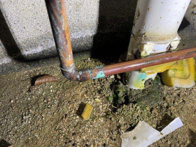 岡山市東区吉井のお客様より「家のどこかから水漏れしているので見て欲しい」と漏水調査のご依頼を頂きました。 お医者さんが使う聴診器のような音調棒と言う道具で水漏れの音を調べてみると、洗面所の給湯配管から漏水していました。