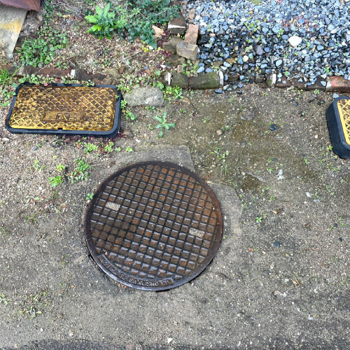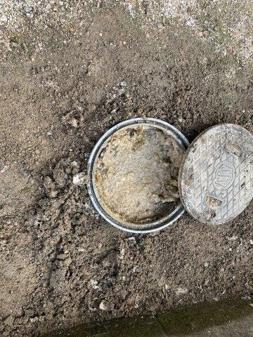 屋外の排水マスのフタが浮いている