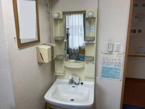 施設の洗面台とミラーキャビネット交換