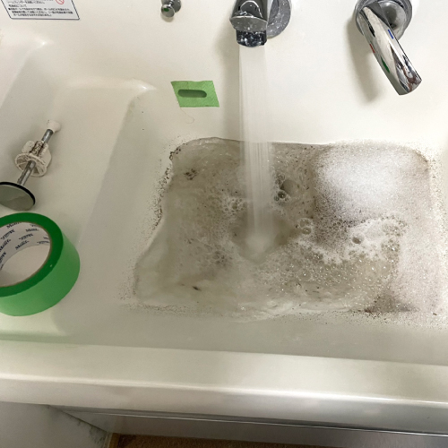 玉野市八浜のお客様から洗面所のつまりに関するご依頼をいただき、伺いました。今回はローポンプ(排水つまりに有効な工具の1つで、空気圧を利用して排水つまりを解消する用具)を使用して作業をおこない、つまりを取り除きました。