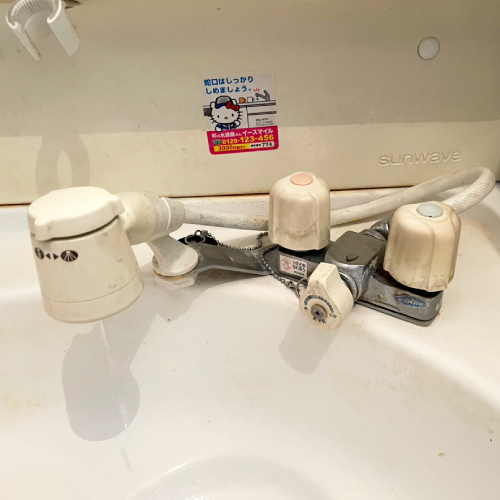 浅口市鴨方町のお客様から洗面所蛇口交換のご依頼を頂きました。 お使いの蛇口はシングルレバー混合水栓です。 長年の使用で水の止まりが悪く漏れるようになってしまいました。 古い蛇口を取りはずしました(^^)/ 取付部