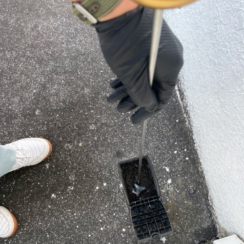 岡山市北区のお客様から水道料金が上がったので調べて欲しいと漏水調査のご依頼を頂きました。 お伺いして漏水調査開始! 地面に敷いたブロックが濡れている部分があります。 ここが怪しいですね。 ブロックを外してみると、大当たり