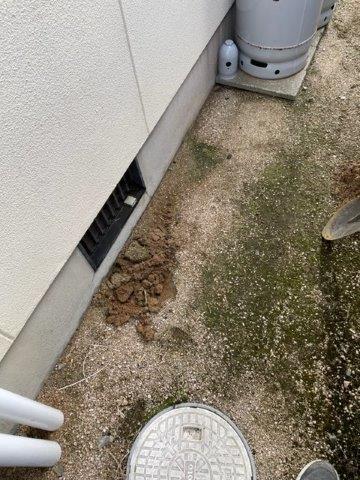 赤磐市のお客様から「洗面所下からシャーッと音がして屋外の床下付近で水漏れしている」と水道管の水漏れ修理でご依頼を頂きました。 お伺いしてみると、洗面所屋外の床下換気口あたりから水漏れしている音がしていました。 この寒波で