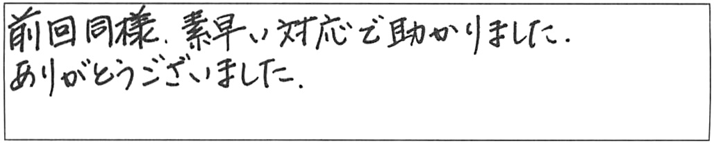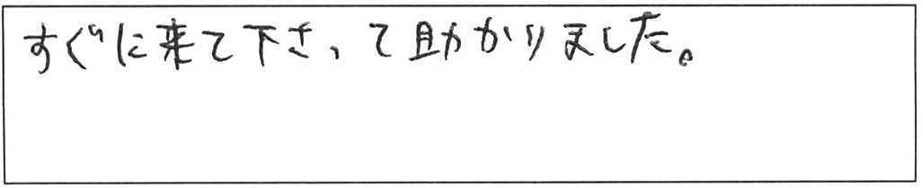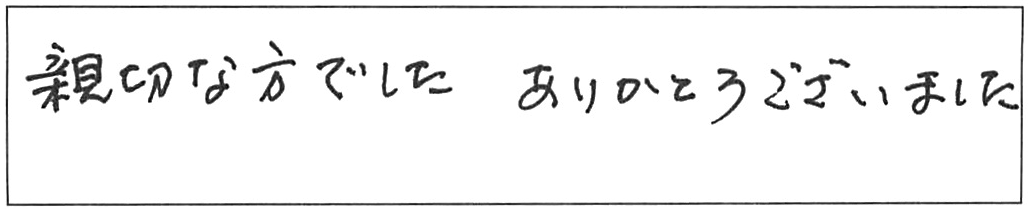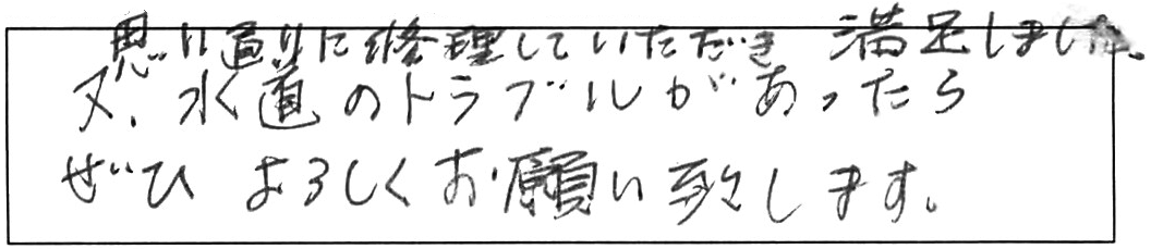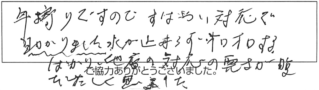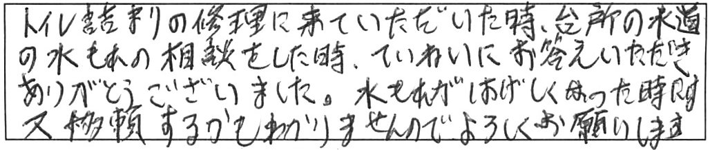 トイレ詰まりの修理に来ていただいた時、台所の水道の水もれの相談をした時、ていねいにお答えいただき、ありがとうございました。
