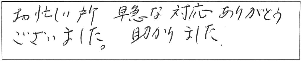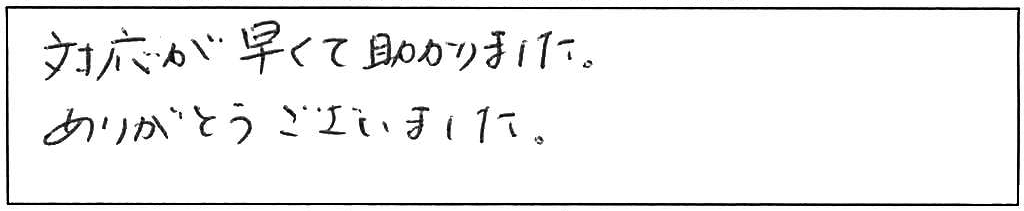 ネットで検索して、貴社を選び連絡しました。担当の築様の親切な対応、技術力の高さ、丁寧な説明とても良かったです。水もれで心配を解消していただき、築様によろしくお伝えください。ありがとうございました。