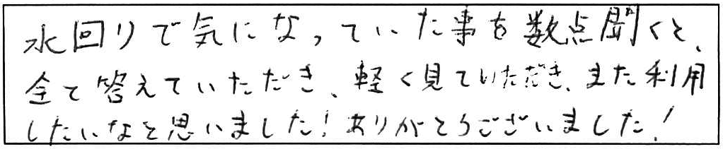 水回りで気になっていた事を数点聞くと、全て答えていただき、軽く見ていただき、また利用したいなと思いました!