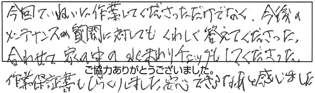 今回ていねいに作業してくださっただけでなく、今後のメンテナンスの質問に対しても、くわしく答えてくださった。