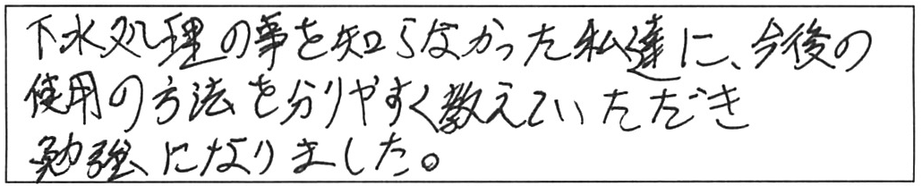 下水処理の事を知らなかった私達に、今後の使用方法を分かりやすく教えていただき、勉強になりました。