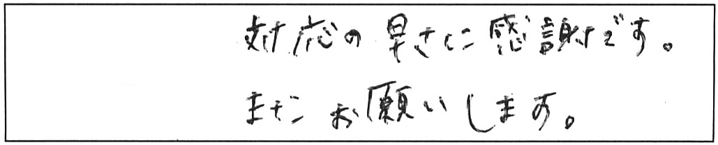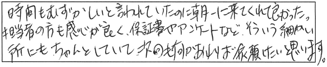 担当者の方も感じが良く、保証書やアンケートなど、そういう細かい所にもちゃんとしていて、次回も何かあれば依頼したいと思います。