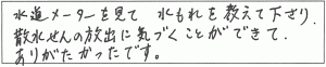水道メーターを見て、水もれを教えて下さり、散水せんの放出に気づくことができて、ありがたかったです。