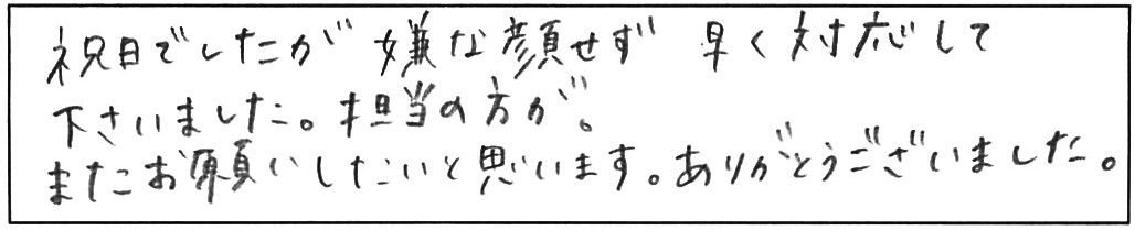 祝日でしたが嫌な顔せず、早く対応して下さいました。担当の方が。