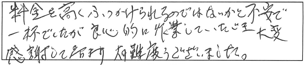 料金を高くふっかけられるのではないかと不安で一杯でしたが、良心的に作業していただき、大変感謝して居ます。