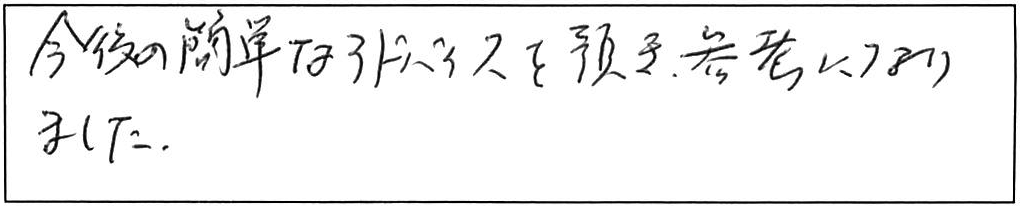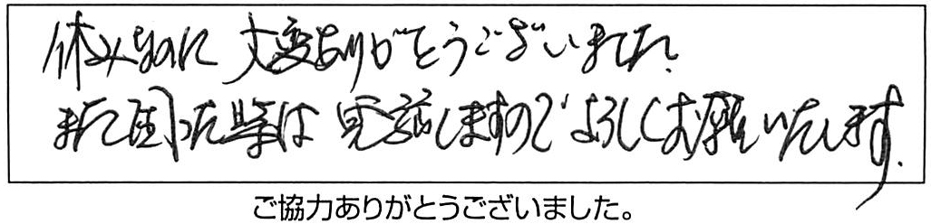 休みなのに大変ありがとうございました。また困ったと時は電話しますのでよろしくお願いいたします。