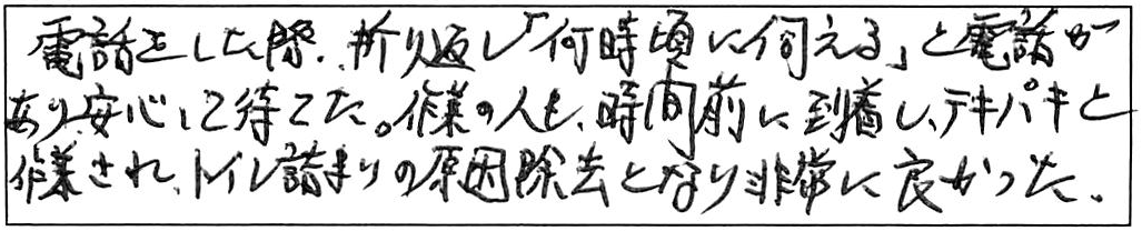 作業の人も、時間前に到着し、テキパキと作業され、トイレ詰まりの原因除去となり非常に良かった。