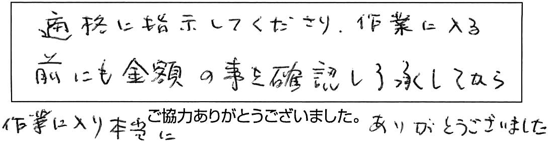 適格に指示してくださり、作業に入る前にも金額の事を確認し了承してから作業に入り本当にありがとうございました。