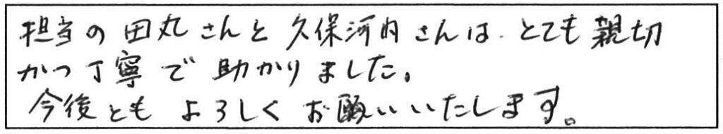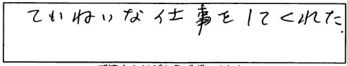 上記のとおり、受付から作業終了まで大変親切で丁寧な応対であり、終始安心してお任せできました。また見積りから作業内容の説明が丁寧で分かり易いからです。こちらからの質問にも丁寧、親切で電話帳の会社以上の対応で満足。乱文、乱筆をお許しください。