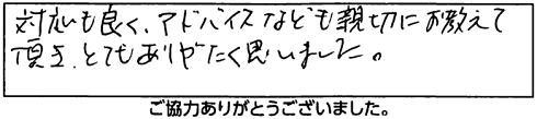 対応も良くアドバイスなども親切に教えて頂きとてもありがたく思いました。