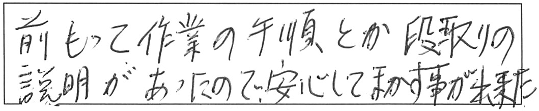 前もって作業の手順とか段取りの説明があったので、安心してまかす事が出来た。