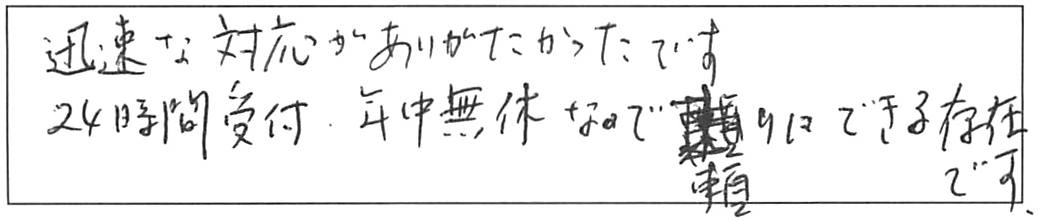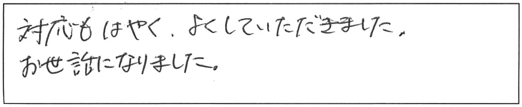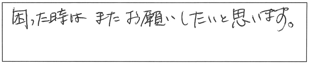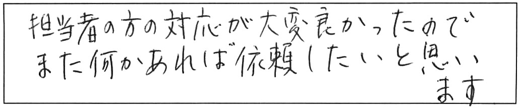 温水器などの交換工事/80代女性 2017-12-19 担当者の中村さんから工事に関する説明を詳しく丁寧にしてもらい、気持ちの良い対応で、とても満足しています。 次回もお願いします。 温水器などの交換工事/80代女性 続きはこちらから >>