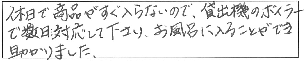 ガス給湯器の交換工事/40代女性 2017-10-19 休日で商品がすぐ入らないので、貸出機のボイラーで数日対応して下さり、お風呂に入ることができ助かりました。 ガス給湯器の交換工事/40代女性 続きはこちらから >>