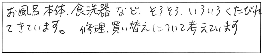 給湯器などの交換工事/50代男性 2018-03-02 お風呂本体、食洗機など、そろそろ、いろいろくたびれてきています。 修理、買い替えについて考えています。 給湯器などの交換工事/50代男性 続きはこちらから >>