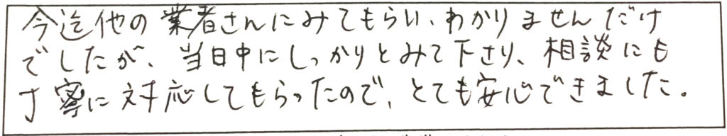 給水・給湯管交換/80代男性 2021-12-14 今迄他の業者さんにみてもらい「わかりません」だけでしたが、当日中にしっかりとみて下さり、相談にも丁寧に対応してもらったので、とても安心できました。 給水・給湯管交換/80代男性 続きはこちらから >>