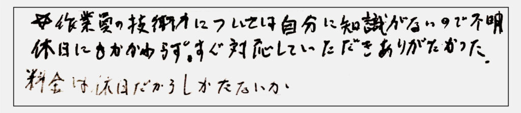 給水・給湯管の交換/80代性男性 2022-03-04 ☆作業員の技術力については自分に知識がないので不明。 休日にもかかわらずすぐに対応していただきありがたかった。 料金は休日だから仕方ないか。 給水・給湯管の交換/80代性男性 続きはこちらから >>